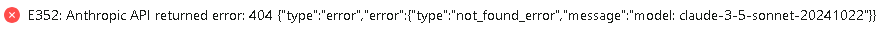 When I connect my Anthropic/C API key and try using the test Prompt in UI Vision, I get the below E352 error. After further investigation, I was able to find that the claude-3-5-sonnet-20241022 model that UI Vision uses has been deprecated. Looking at the GitHub Repro, I see UI Vision uses a static variable for claude-3-5-sonnet-20241022. Can UI Vision be updated to use Claude Sonnet 4 or Claude Sonnet 3.7?