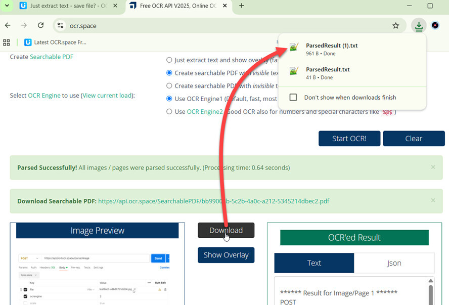 On OCR.space, when I use “Just extract text…” I need to select the output, copy it, create a file and paste it. Is there any way that I can download the extracted text into a file the way I can download output pdfs?