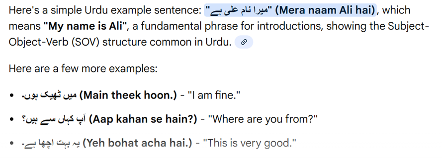 Here's a simple Urdu example sentence: "میرا نام على ہے" (Mera naam Ali hai), which means "My name is Ali", a fundamental phrase for introductions, showing the Subject-Object-Verb (SOV) structure common in Urdu.